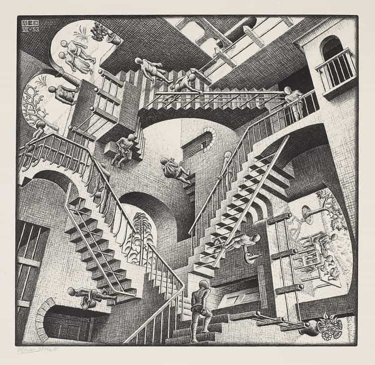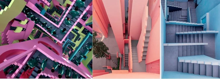 Another impressive space is the large hall filled with multi-colored stacked stairs that connect the players’ dormitory with the playing areas. This tangle of steps, doors, and windows finds its inspiration in two main works: La Muralla Roja by Ricardo Boffil and Relativity by M. C. Escher. In this maze, players appear disoriented and trapped, tiny and insignificant, like pawns in a game. Other equally elaborate settings will not be described so as not to spoil the series.